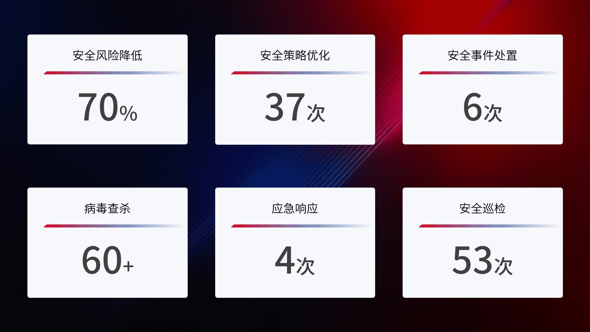 提供全面的安全事件报告体系,,,包括处置报告、、、、周报、、、、季度和年度总结,,结合持续监控,,,,帮助客户深入了解网络安全状况。。。。