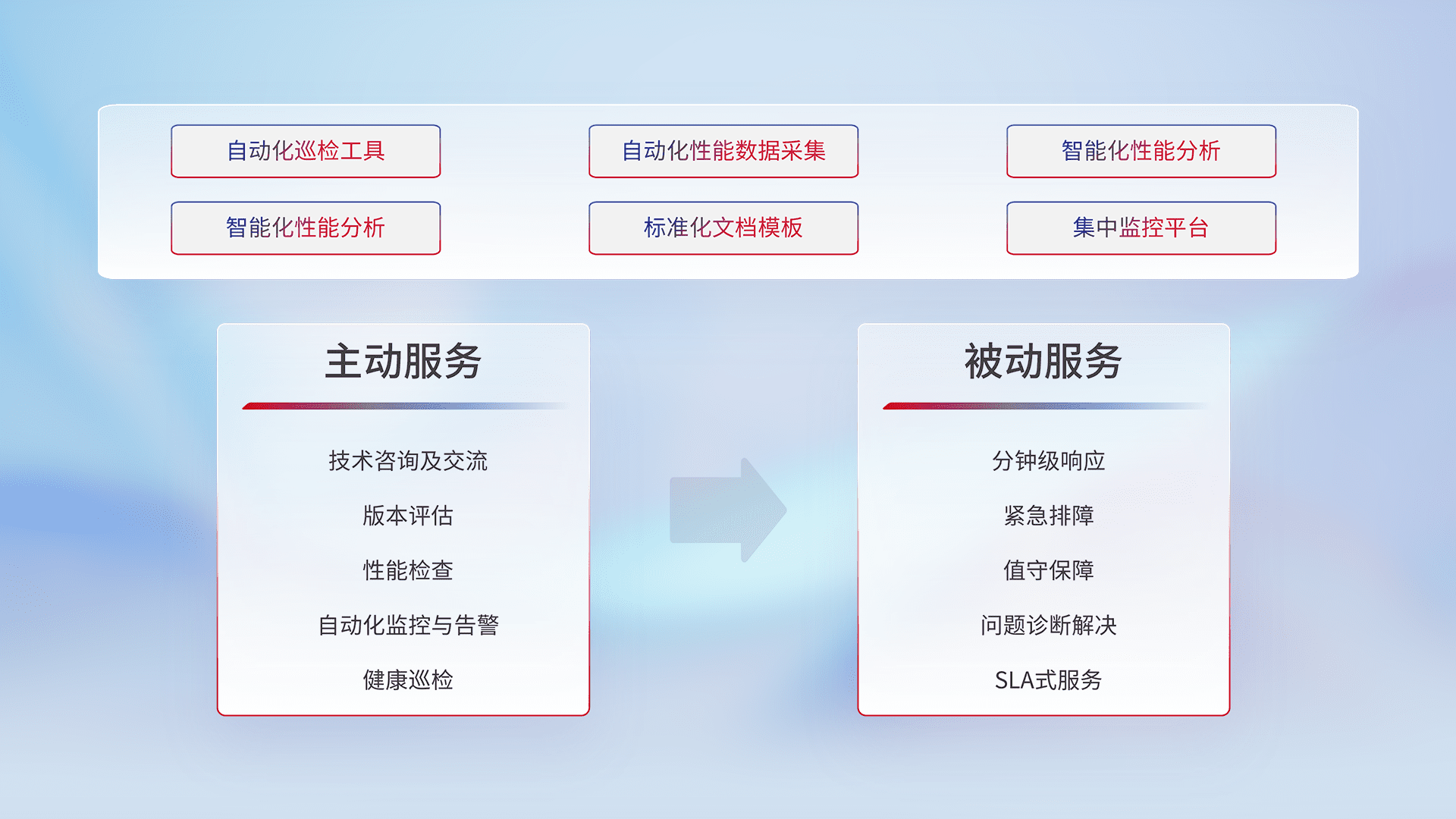 智能化工具和标准化文档,,保障服务质量,,,,提供主动服务(包含技术咨询、、、版本评估、、性能检查、、自动化监控与告警、、、健康巡检)和被动服务包含(分钟级响应、、、紧急排障、、、、值守保障、、问题诊断解决、、、、SLA服务)。。